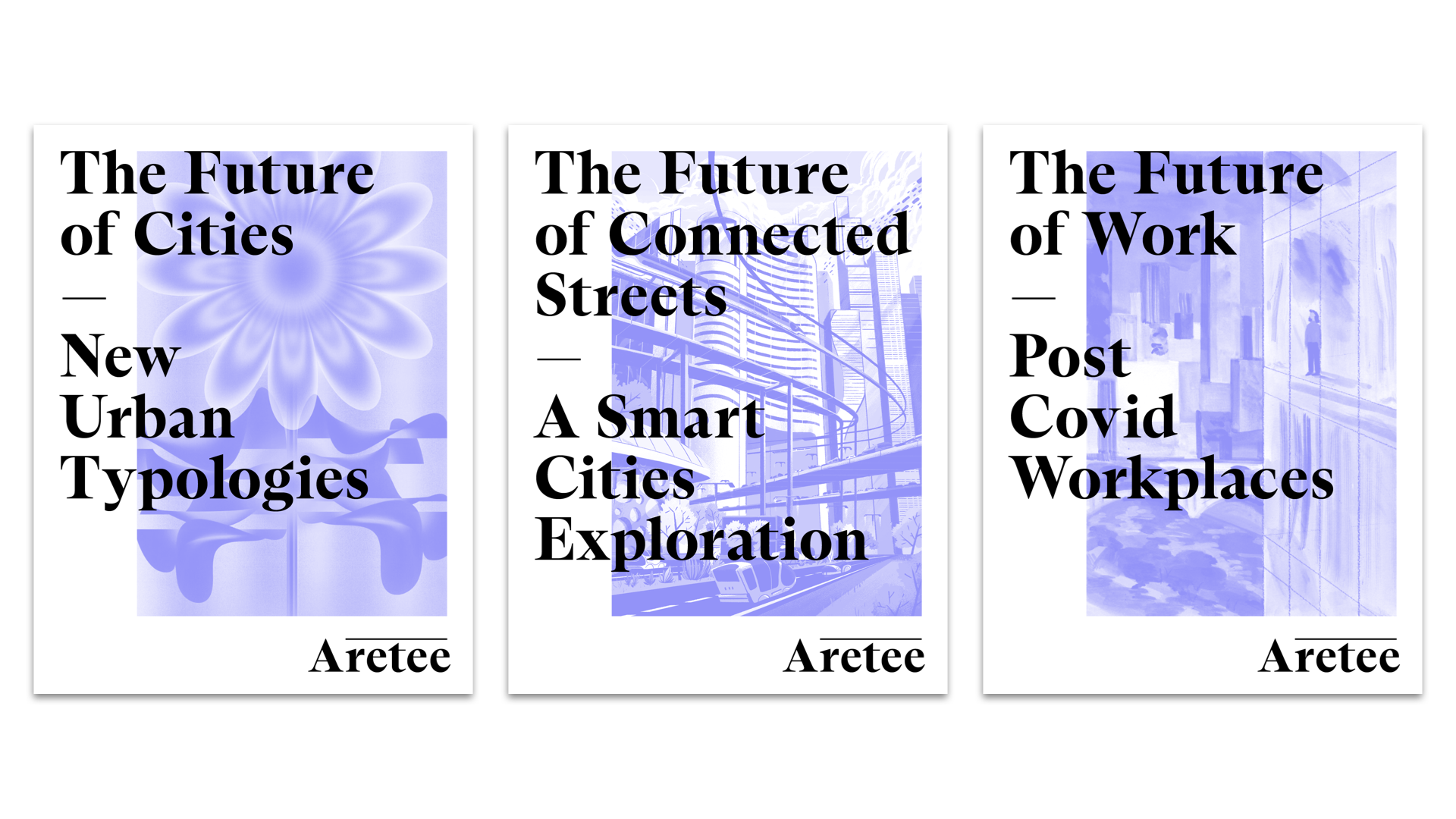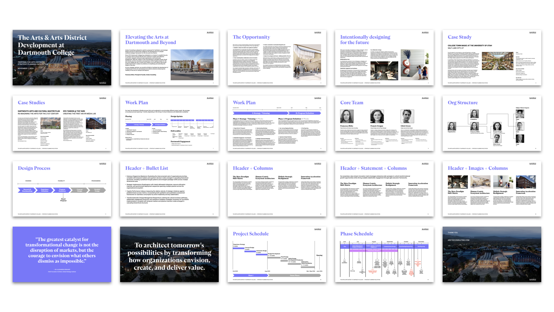 Drawing inspiration from the ancient Greek concept of arete—excellence as virtue—the identity balances confidence with approachability through two essential elements: a bold horizontal bar and the wordmark set in Arizona Serif. The typeface's high-contrast, pointed serifs and dramatic stroke variations create distinctive, dynamic letterforms. Above, the horizontal bar acts as both pronunciation guide and graphic anchor—its substantial weight providing stability and strength while nodding to the founder's French-Canadian heritage. A duochromatic palette of lilac blue and light grey complements the confident typography across all applications. Editorial-style imagery brings strategic concepts to life with sophistication and imagination. The system extends into comprehensive presentation templates and proposal frameworks, empowering the team to articulate complex insights with clarity and confidence.