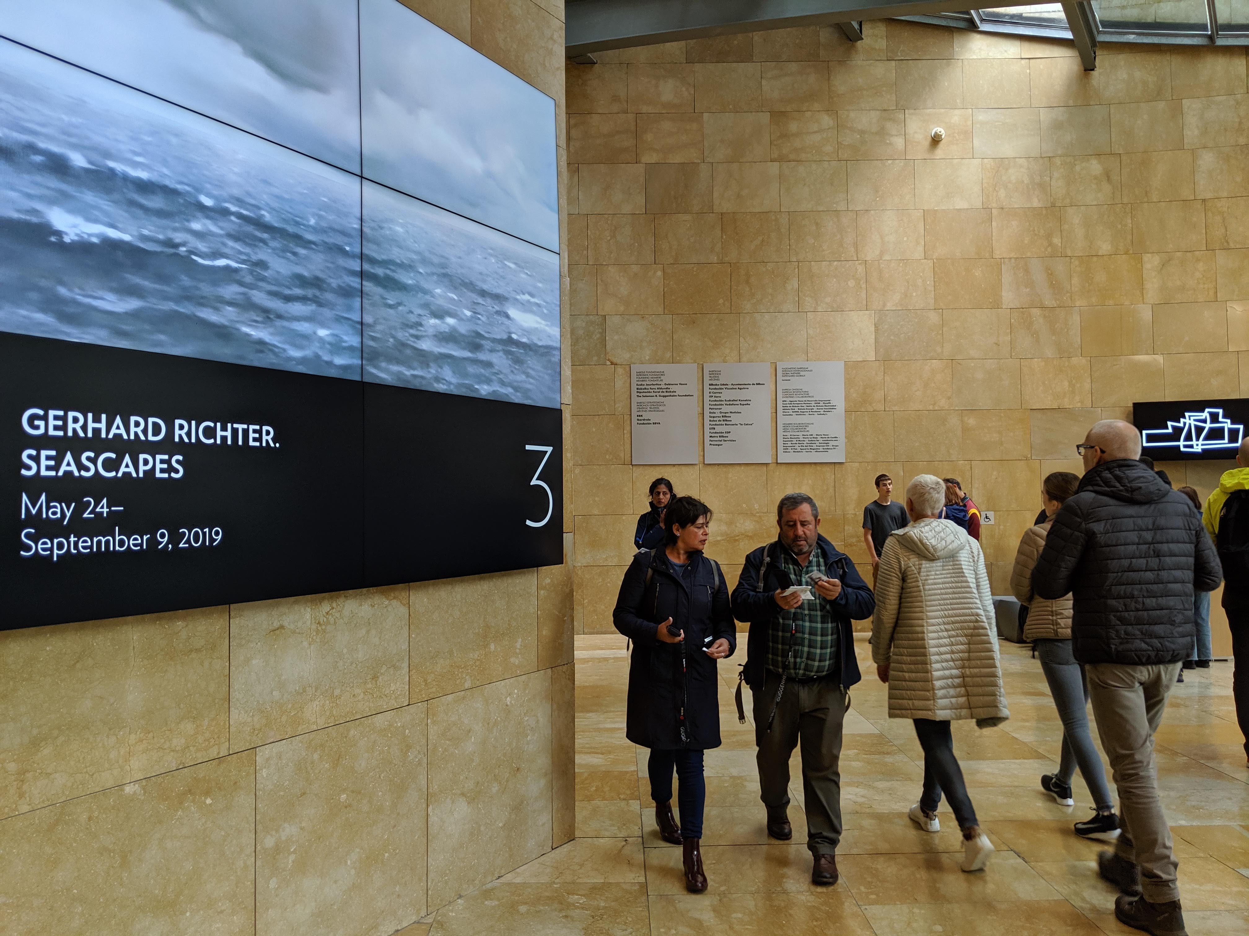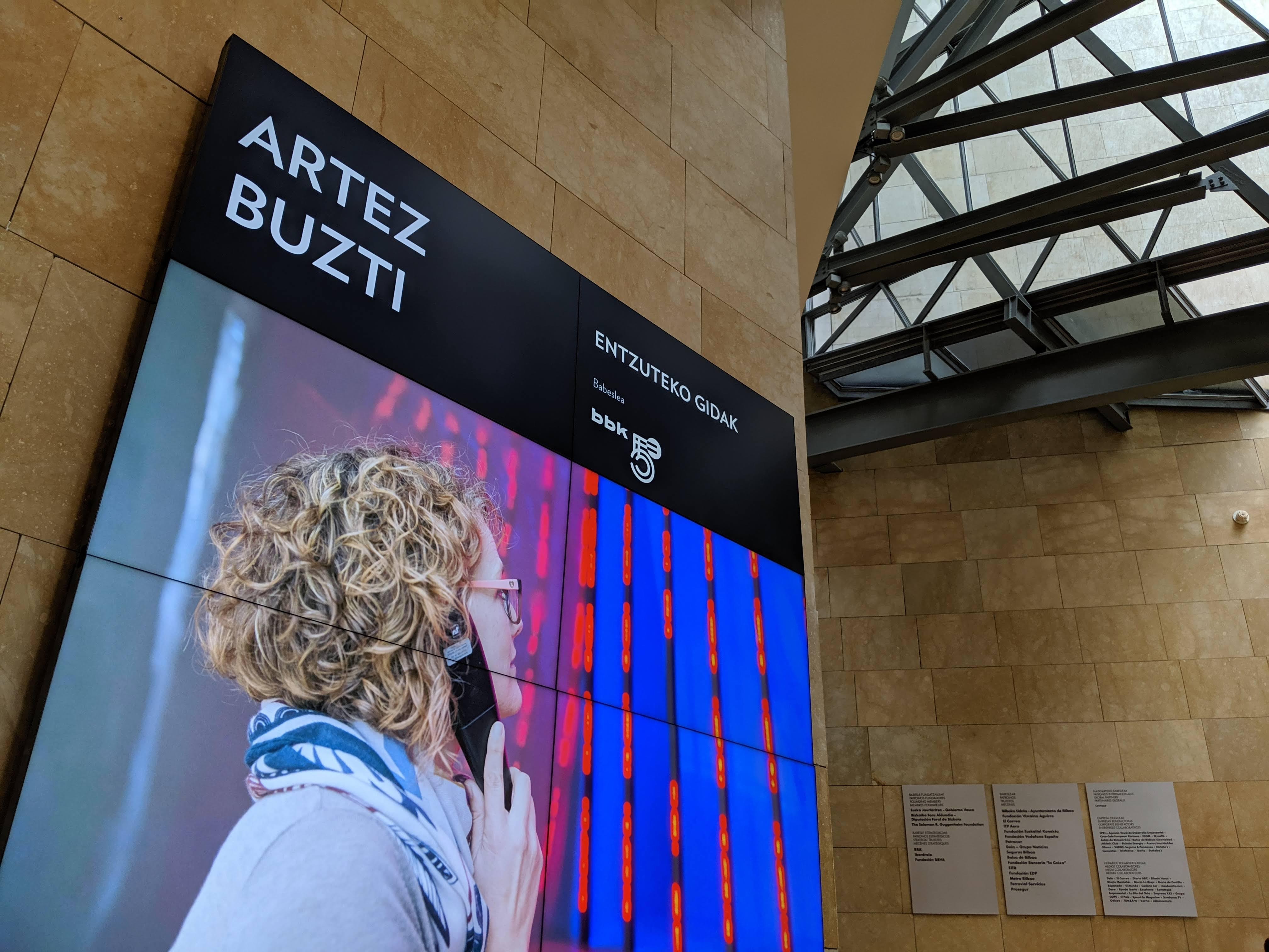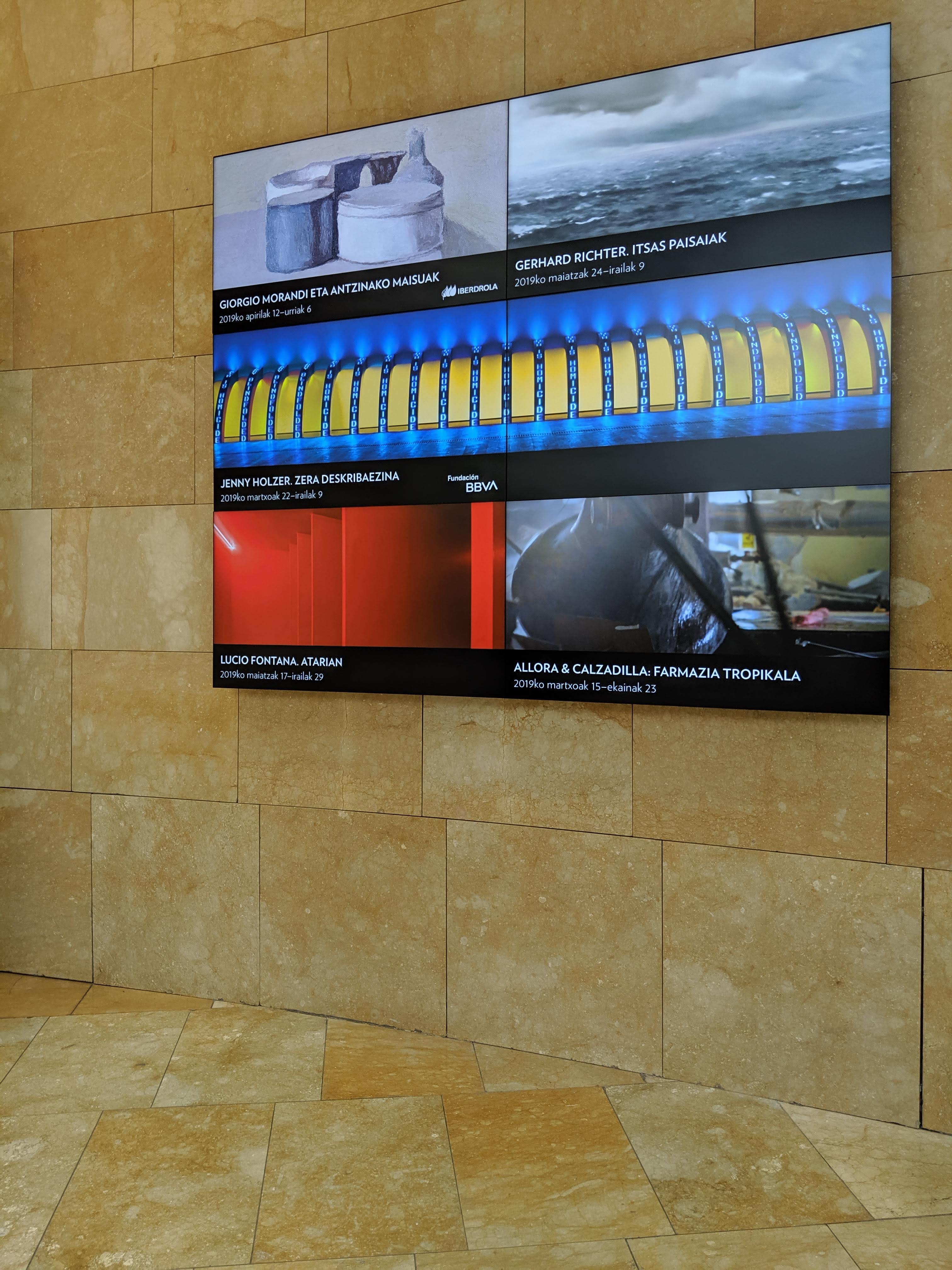 All physical elements—ticketing desk, information desk, security posts, audioguide storage—were designed to enhance the experience for visitors and staff while staying true to the spirit of the building. Working with the museum's in-house design team, we standardized digital content templates and physical signage to provide essential information clearly and effectively. A modular graphic system emphasizes transformation through rich imagery of the museum's past and present, with the Guggenheim Bilbao logo as connective tissue across all digital signage—adding moments of surprise and discovery throughout the new lobby.