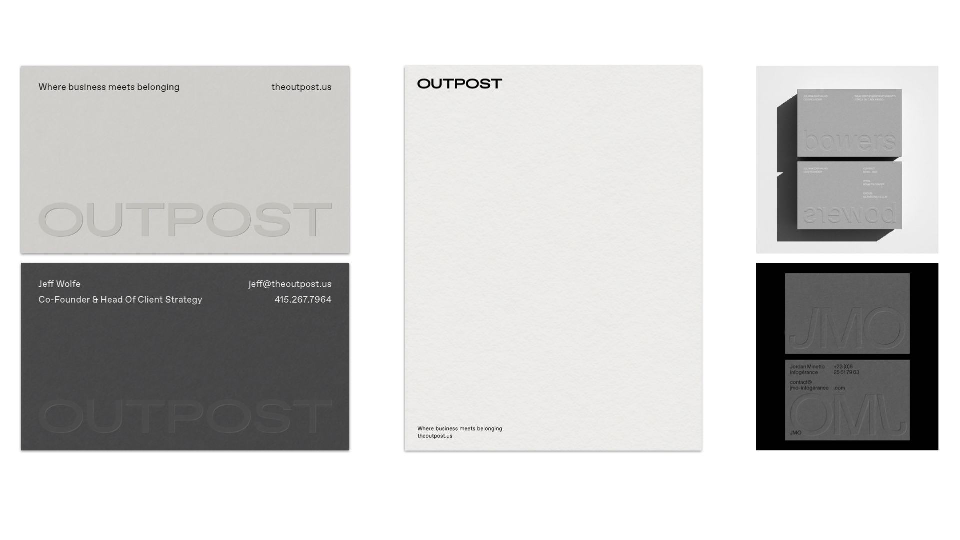 Positioned between big event companies and small production houses, Outpost blends hospitality precision with cultural fluency—creating corporate experiences and cultural activations grounded in human connection. As the agency evolved, it needed refinement and clarity across every touchpoint. Working closely with the founders, I developed a comprehensive identity system built on a monochromatic approach where restraint amplifies presence.